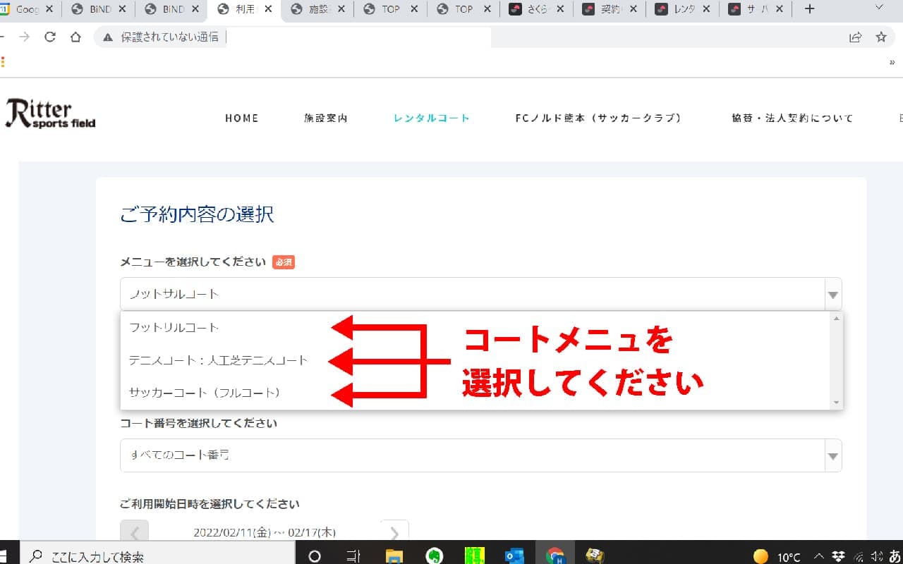 2.利用料金の下にある予約システム部分のコートメニューを選択します(フットサル・テニス・サッカー)