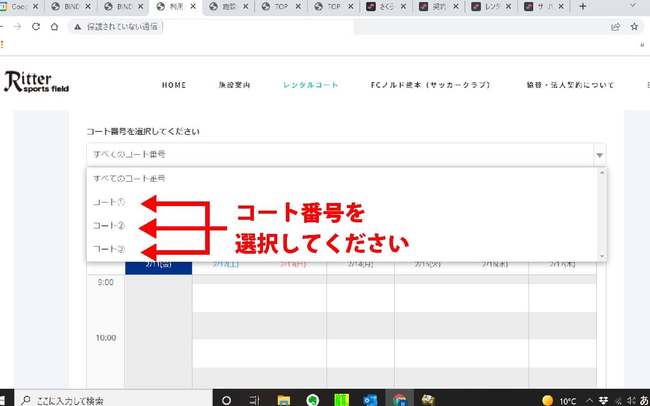 3.コート場所の選択を行います。※コート番号は施設説明ページをご覧ください。