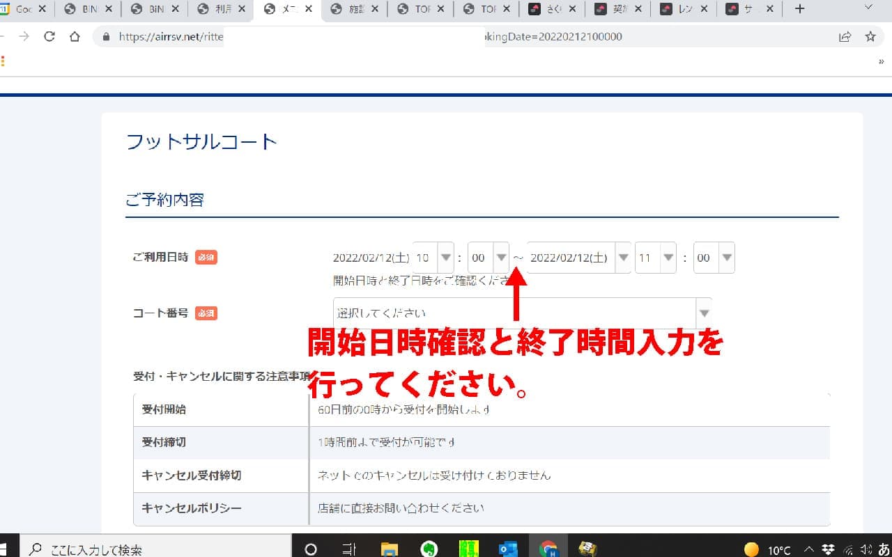 5.ページが切り替わり最初の部分の予約希望日時の確認と終了時間の入力を行ってください。