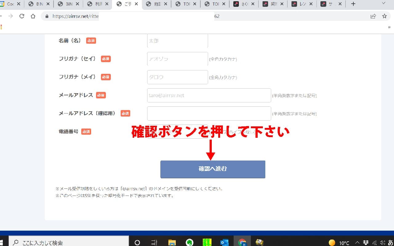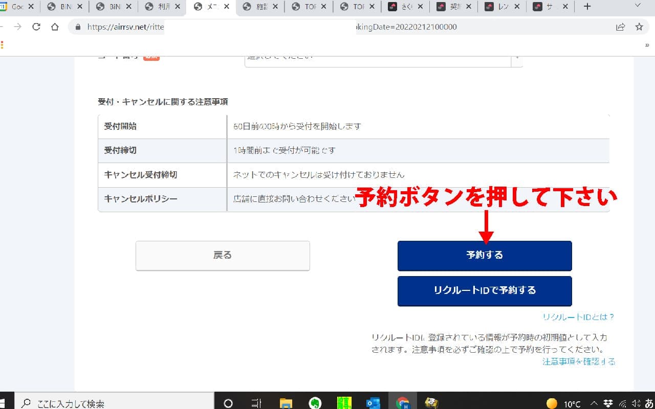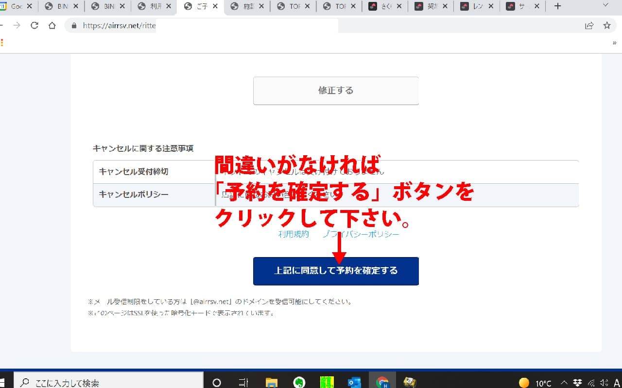 9.修正が必要ならば修正をしてください。内容が正しければ「上記に同意して予約を確定する」ボタンをクリックしてください。