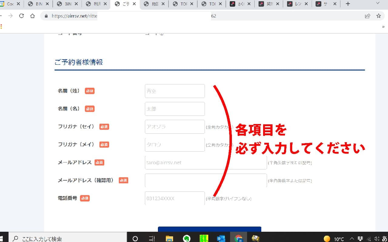 7.ページが変わって「予約者情報」の各項目に必ず入力を行ってください。